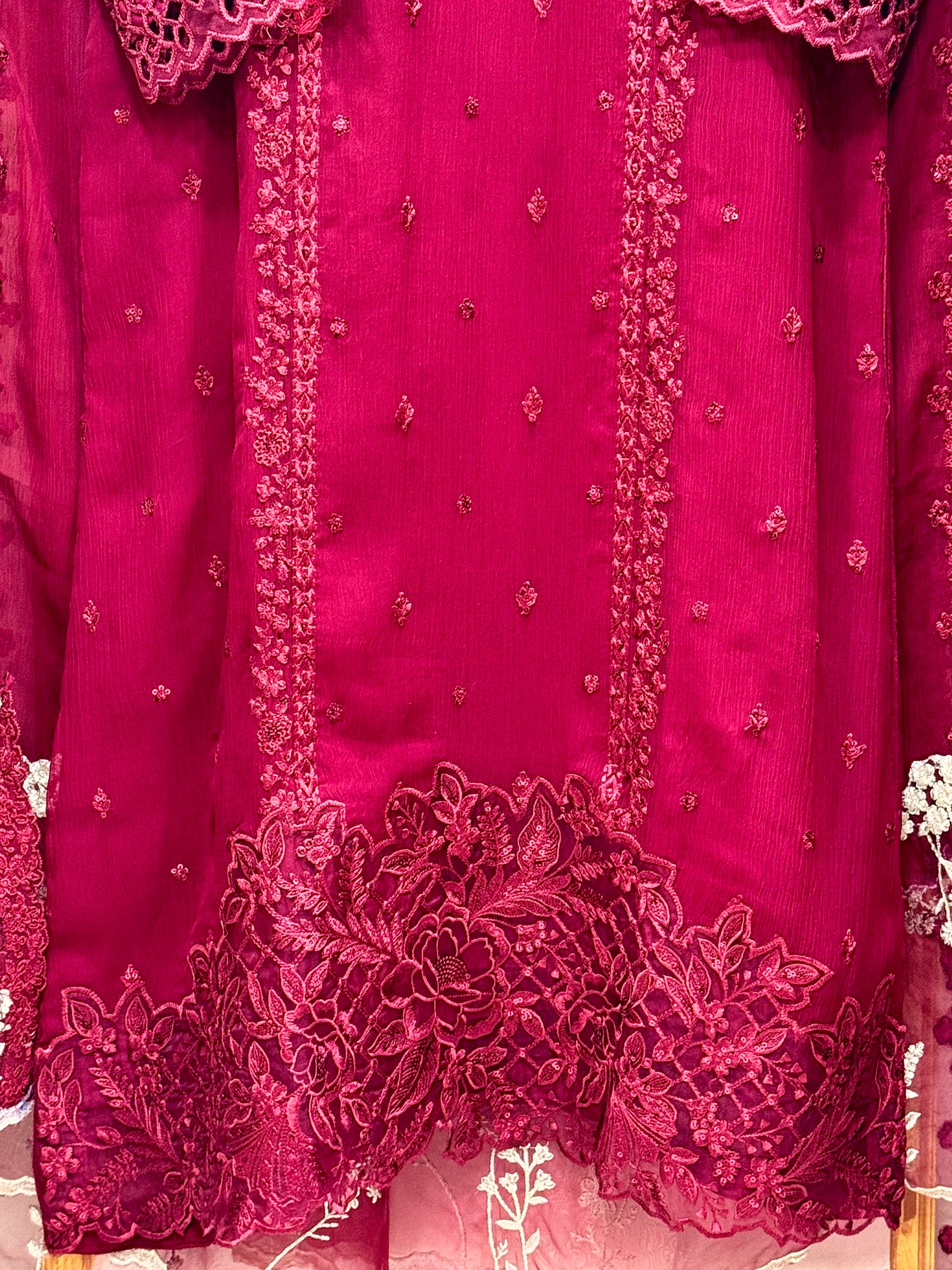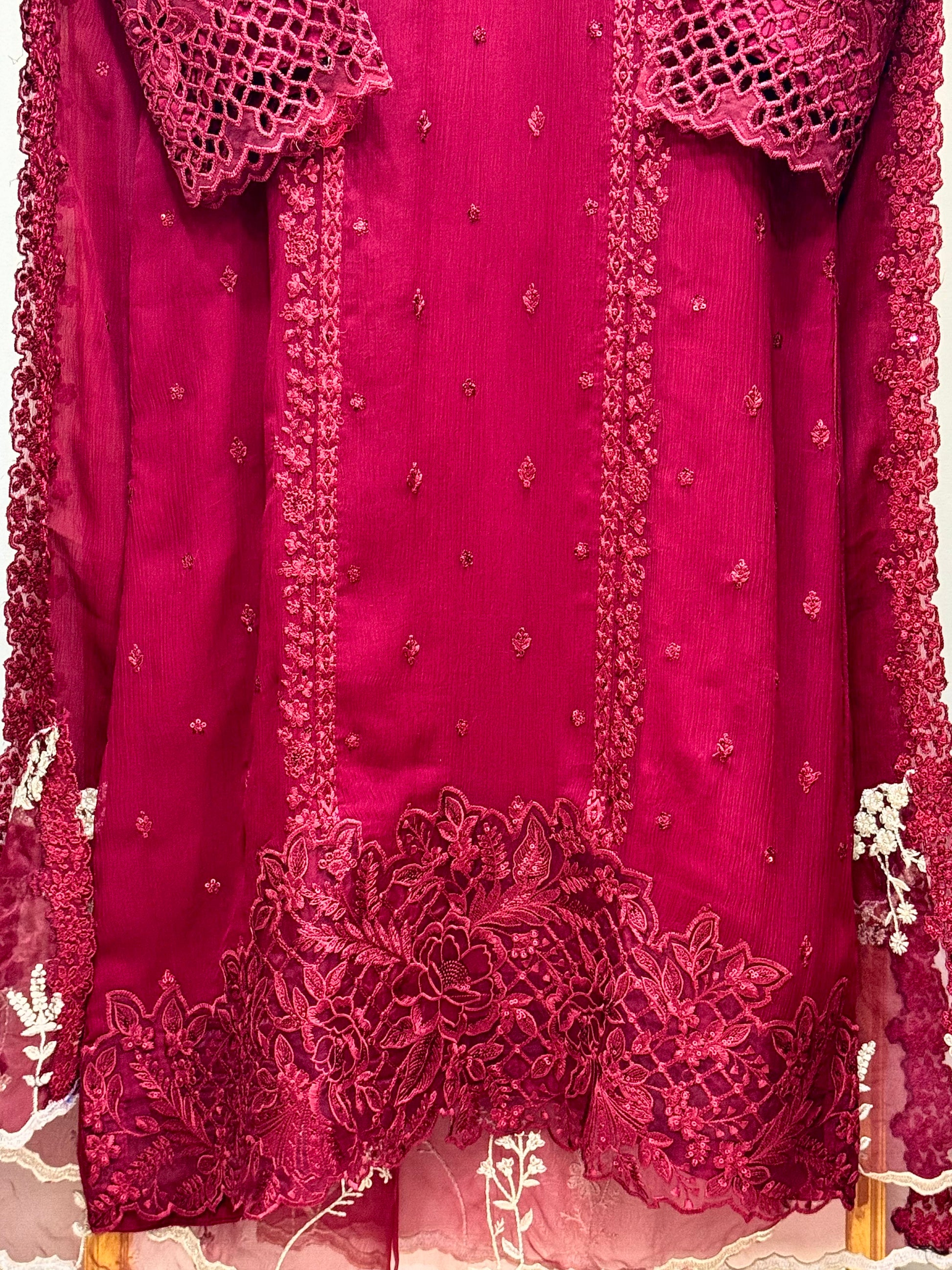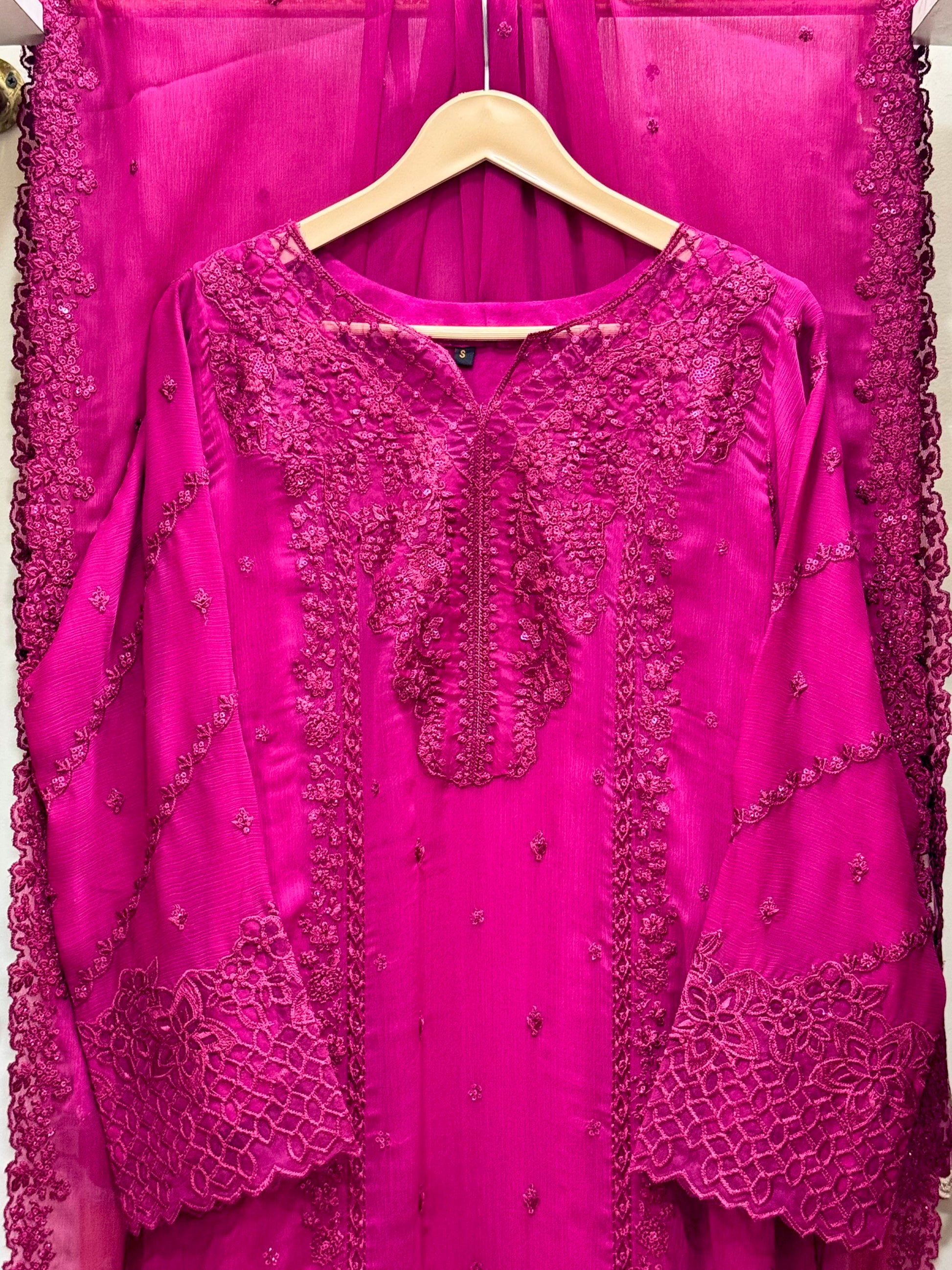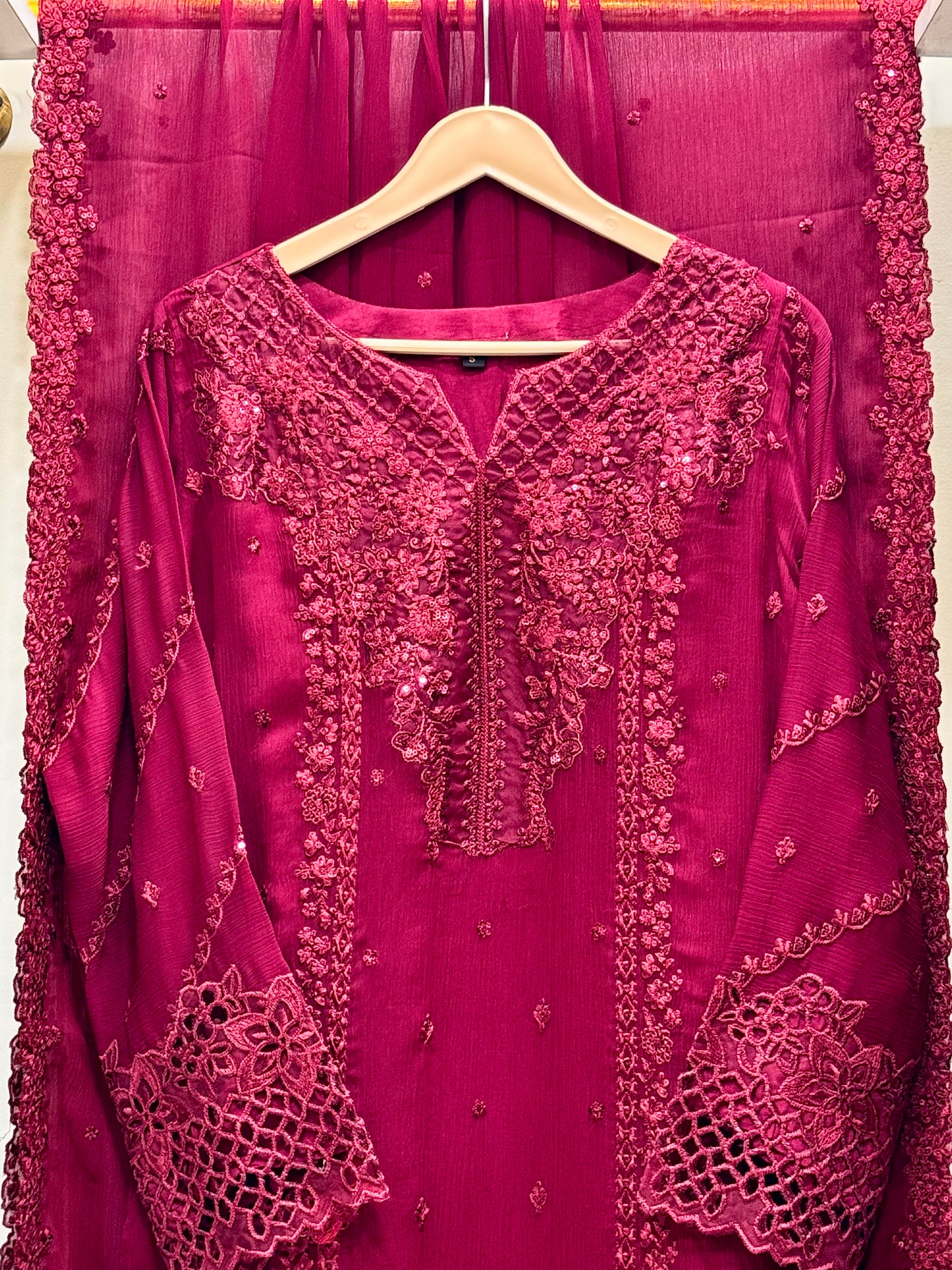 Experience refined elegance with our 3PCS Embroidered Chiffon Suit. Meticulously designed, this set combines graceful craftsmanship with unparalleled comfort for a look that is both sophisticated and effortlessly stylish.