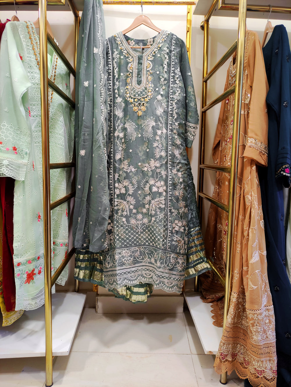 Redefine festive fashion with our Printed chiffon handwork gharara paired with an embroidered dupatta and soft silk trouser—made for Pakistani weddings. 💖
