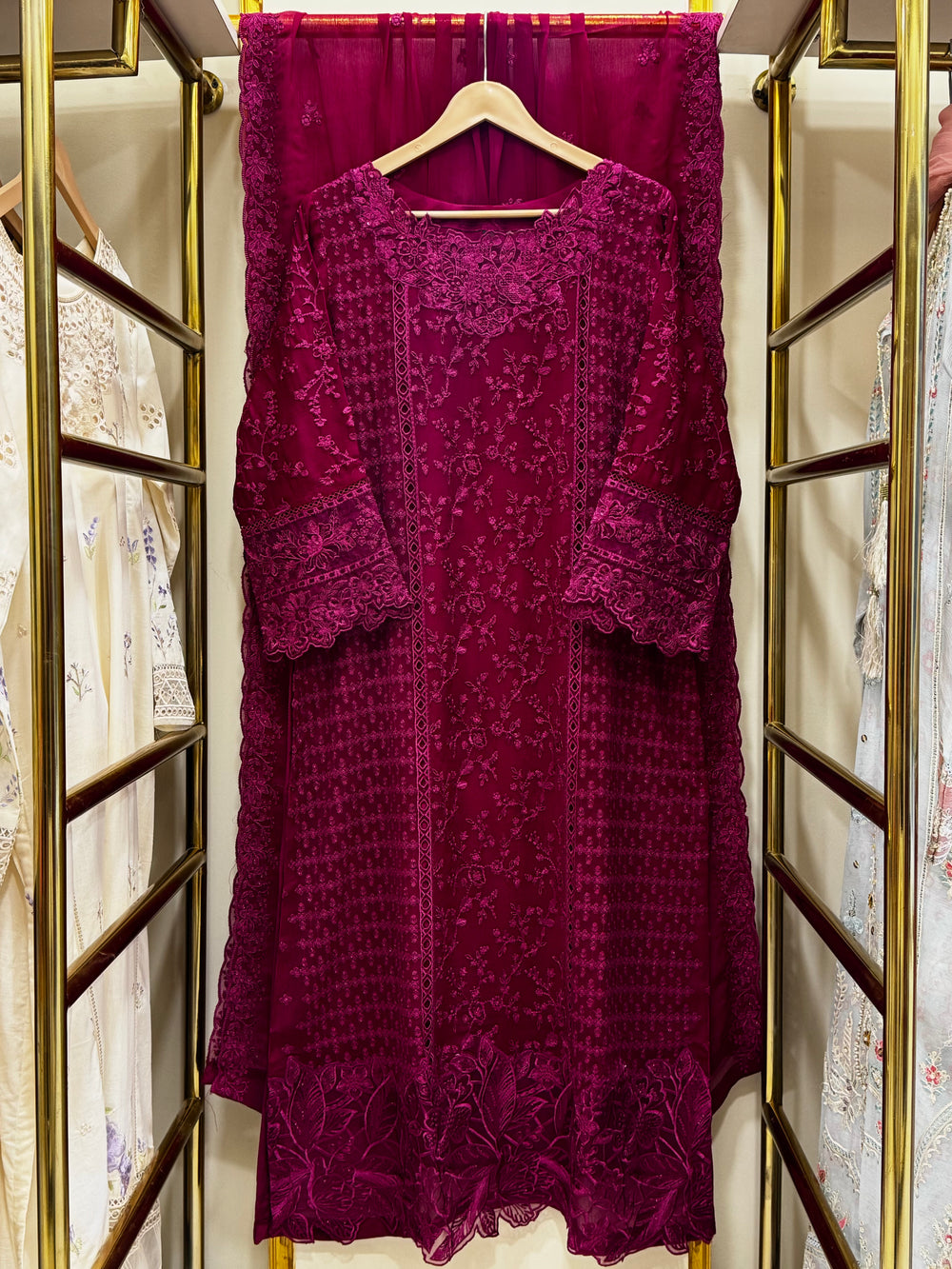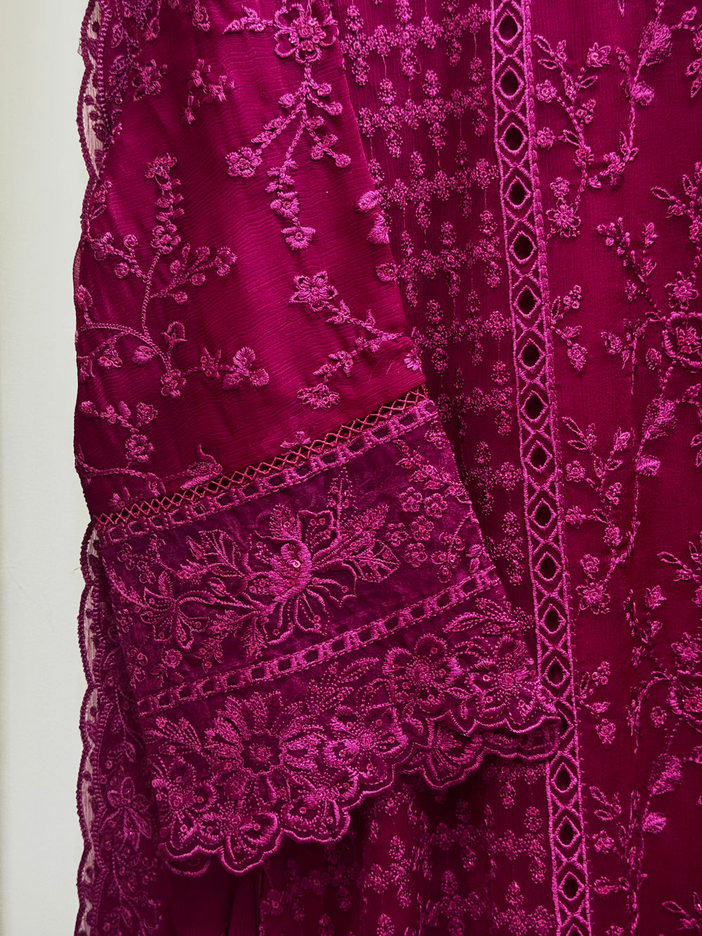Crafted in rich crimson-magenta chiffon, this three-piece ready-to-wear ensemble features intricate sequin embroidery, a finely finished dupatta, and tailored raw silk culottes. Designed for winter weddings and formal evenings, Crimson Bloom delivers timeless sophistication with effortless grace.