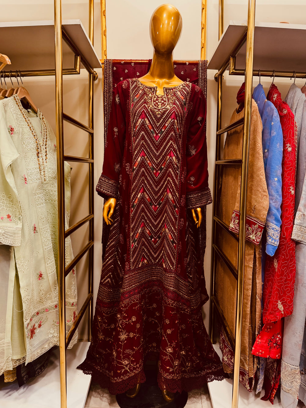 Step into a world of elegance with Elysian Dream, a Luxury Embroidered Bamber Chiffon Gown designed for the modern woman who adores timeless glamour. Crafted from premium Bamber chiffon, this gown features intricate hand embroidery, delicate sequins, and sparkling embellishments that add a magical touch to your look.