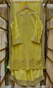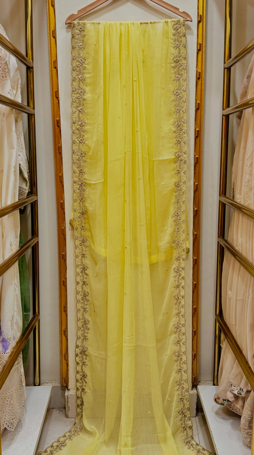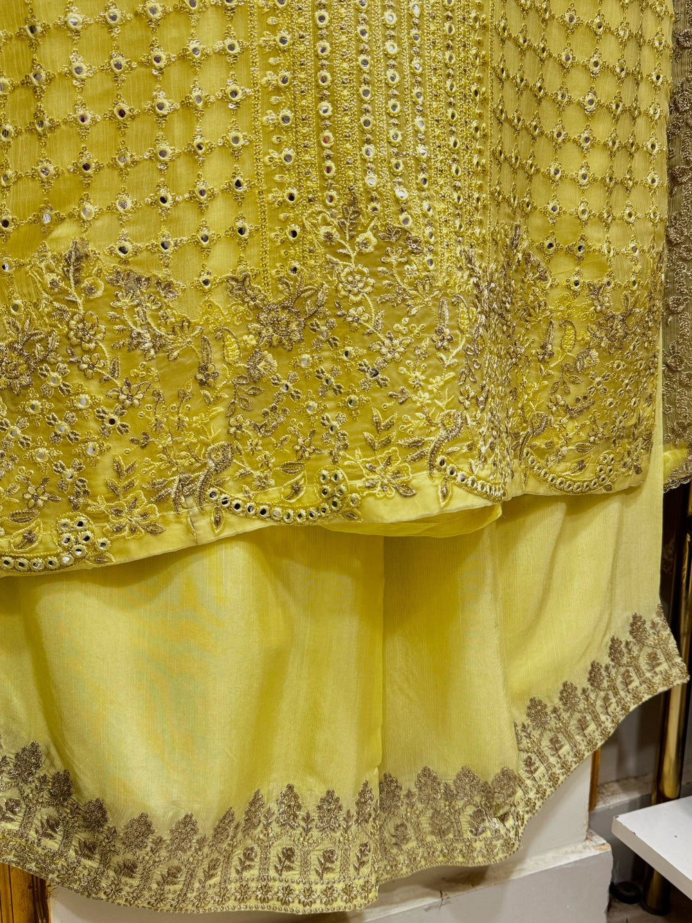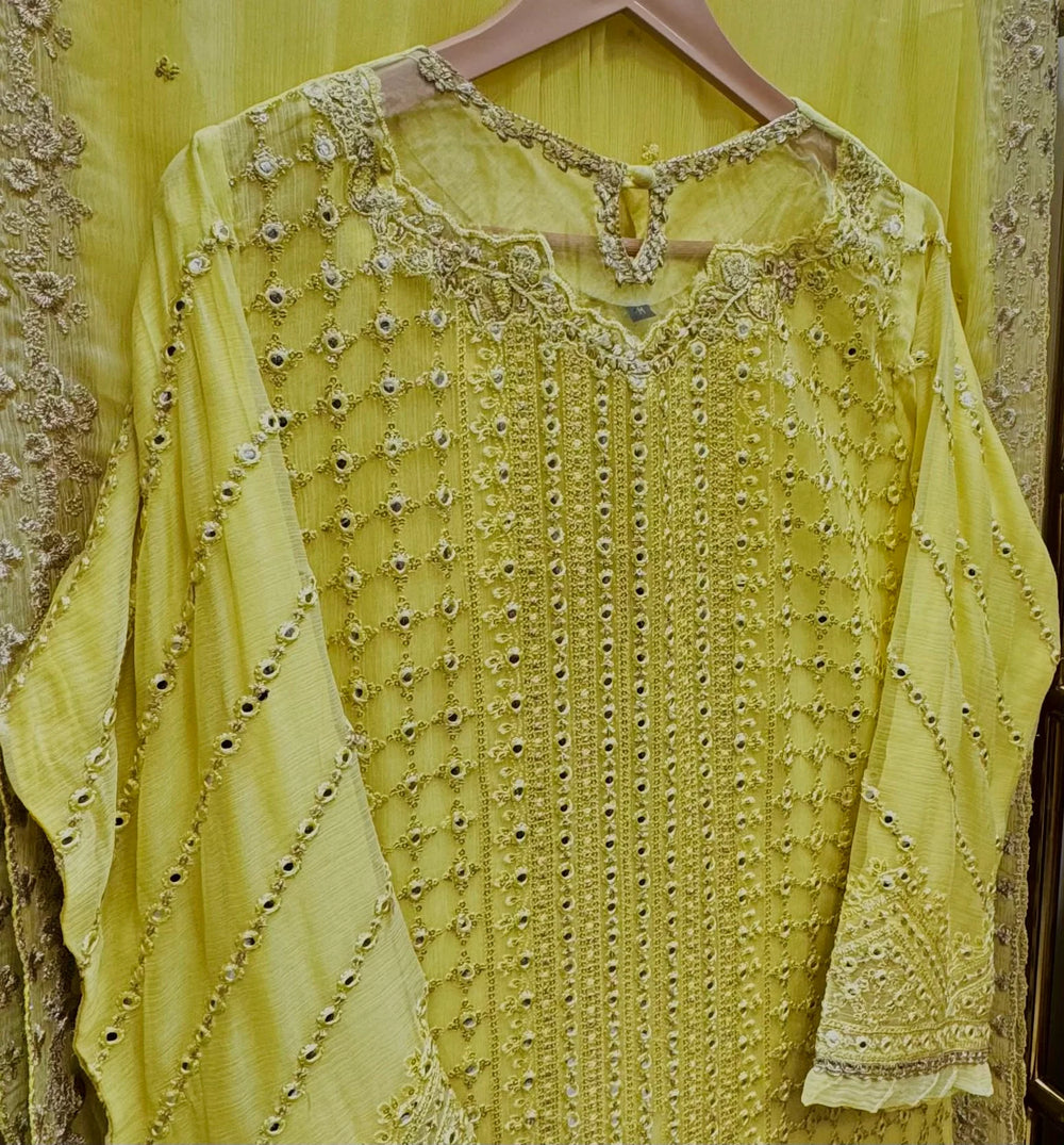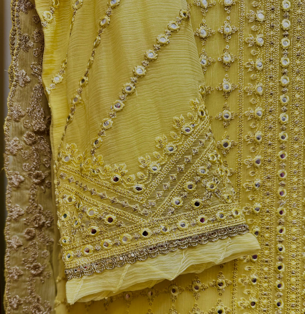 Golden Ember is a luxurious mustard chiffon ensemble designed for effortless glamour and sophistication. The shirt is fully adorned with sequins, creating a radiant shimmer that catches every light. Paired with a delicately embroidered chiffon dupatta and tailored raw silk culottes, this ready-to-wear outfit combines elegance with contemporary style. Perfect for weddings, festive evenings, and formal celebrations.