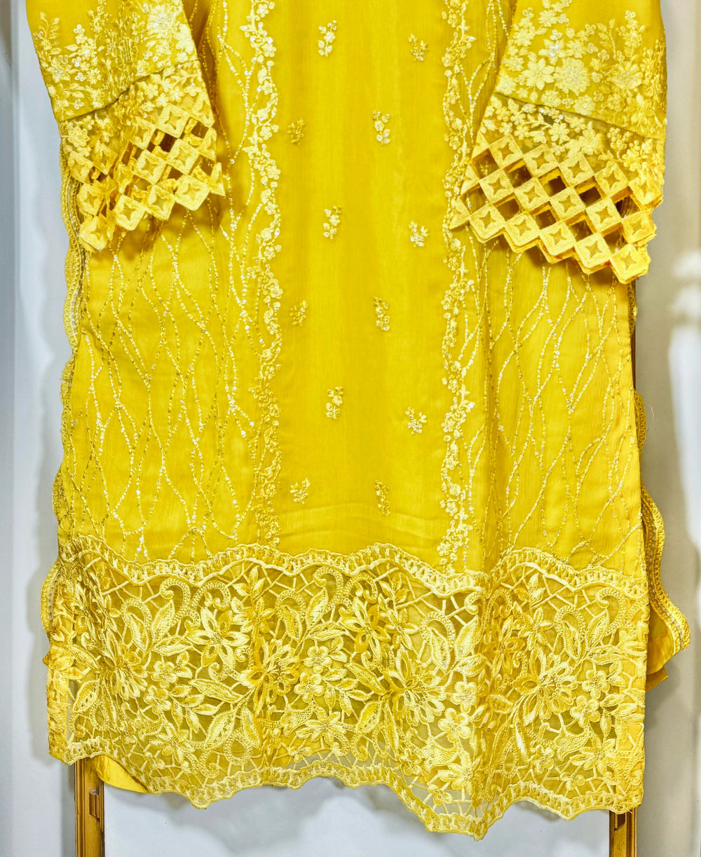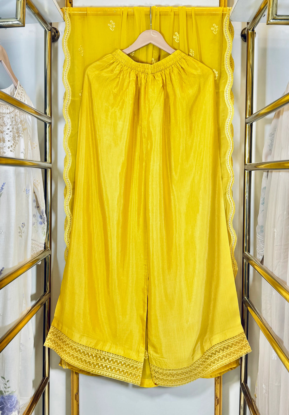Golden Whisper radiates warmth and festive charm in a refined mustard hue. Featuring delicate floral embroidery on a sheer chiffon base, this three-piece ensemble is designed to feel light, elegant, and celebratory.
