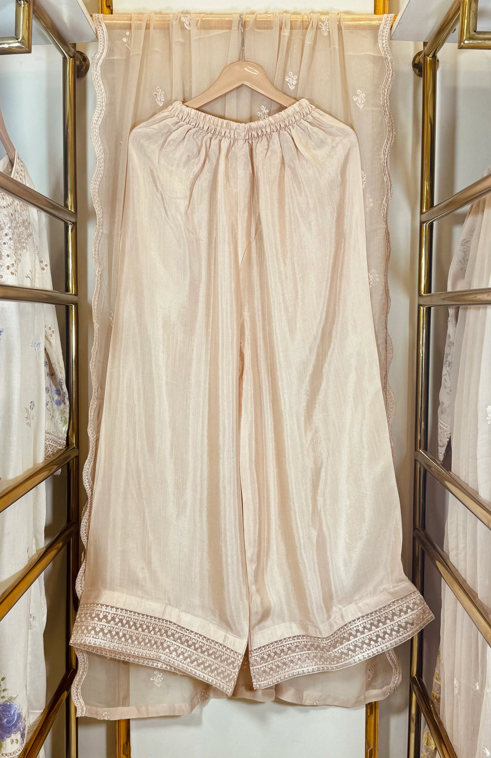 This three-piece ready-to-wear ensemble with tailored trousers and a finely finished embroidered dupatta is perfect for winter weddings, formal luncheons, and elegant evening gatherings where understated luxury leaves a lasting impression.