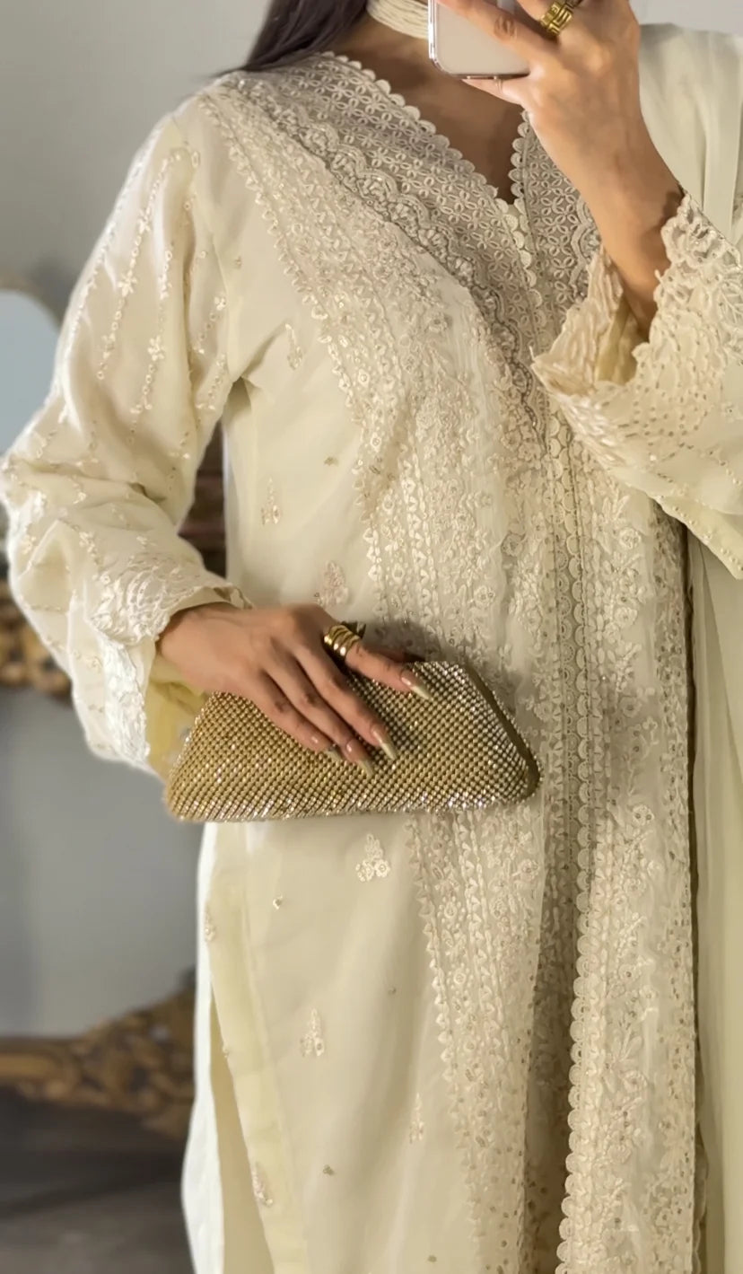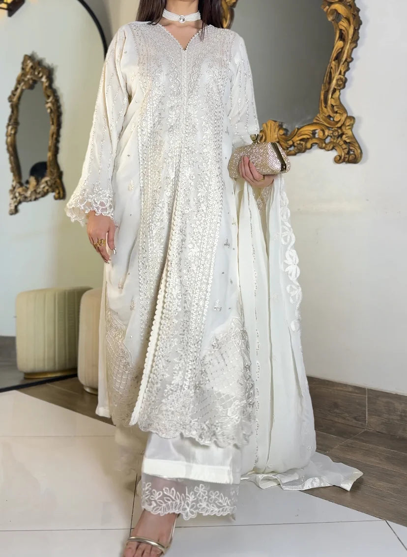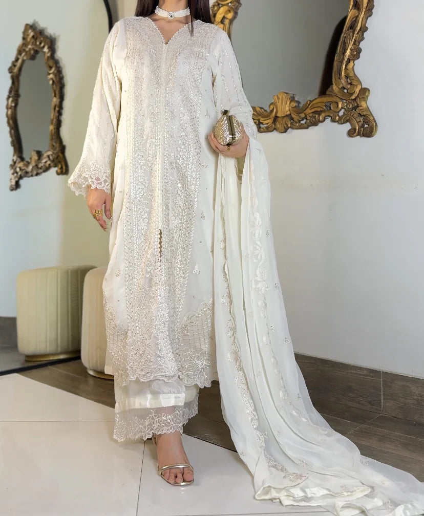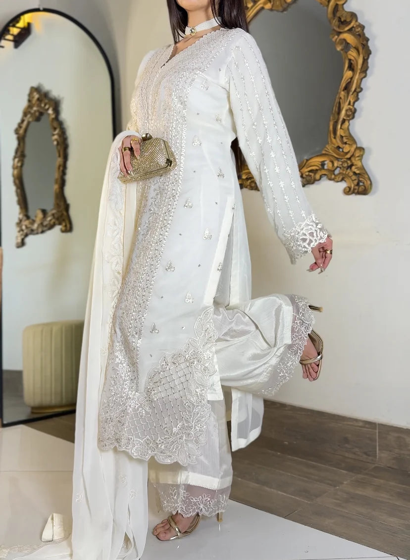 Ivory Whisper is the purest expression of understated luxury, rendered in a refined white palette that highlights intricate embroidery with graceful clarity. The kurta features delicately detailed front panels, embellished sleeves, and a softly scalloped embroidered hem, creating an aura of effortless sophistication.