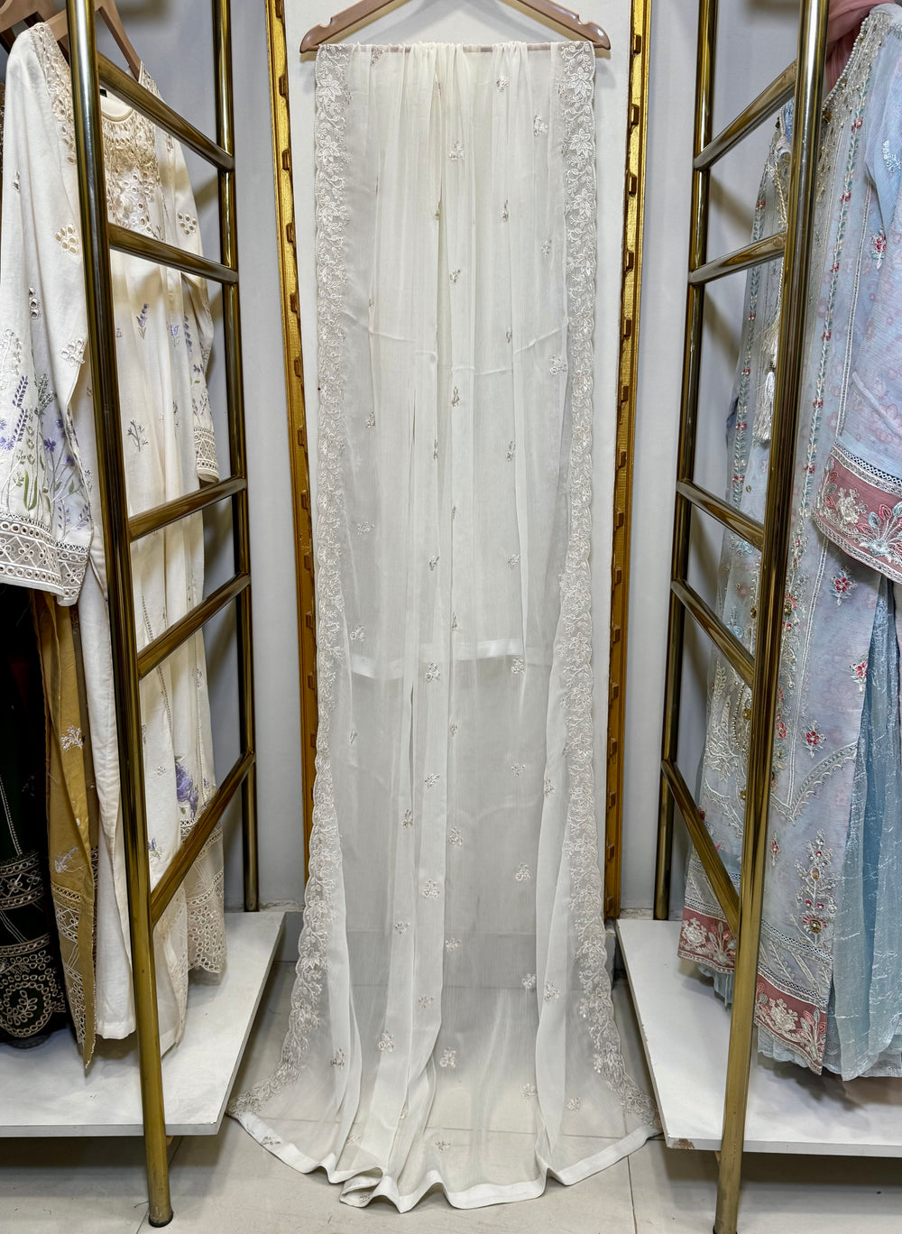 A premium fully stitched pastel‑white chiffon 3‑piece set featuring delicate sequin embroidery, an embroidered chiffon dupatta, and raw silk culottes for a modern, refined finish—perfect for weddings and formal evenings.