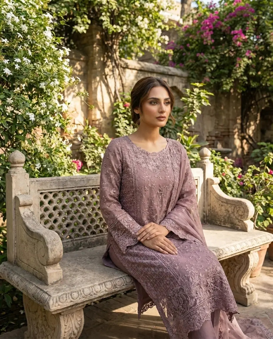 Introducing Orchid Aura, a premium 3-piece ensemble crafted in a soft dusty-mauve shade, designed for women who appreciate refined elegance with a touch of sparkle. This outfit blends delicate threadwork with subtle sequin embellishment, creating a sophisticated couture feel inspired by Maria B, Asim Jofa, and Azure aesthetics.