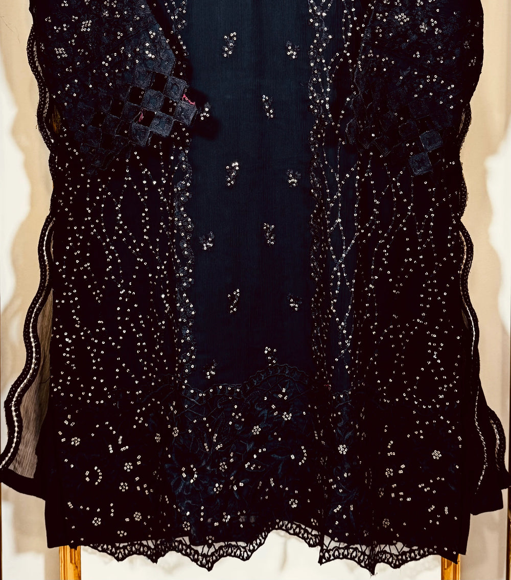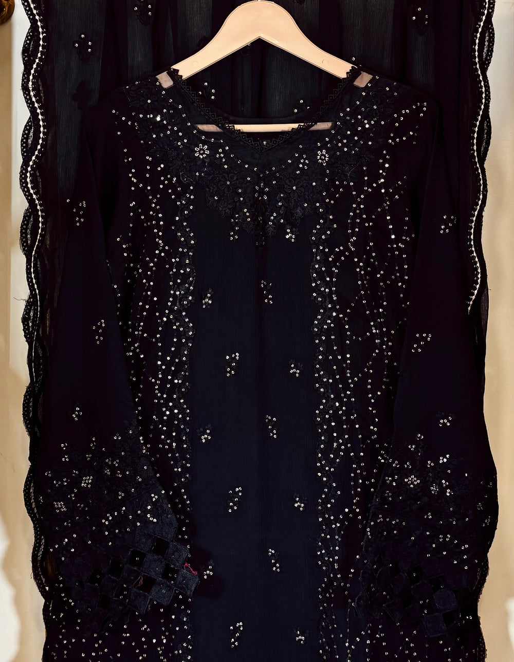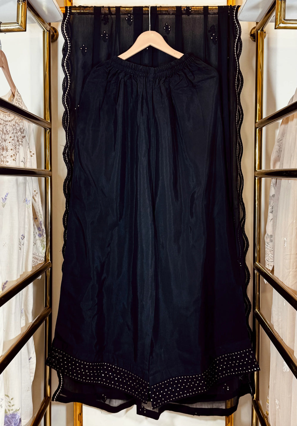 Whispered Noir is a timeless expression of elegance crafted for refined formal wear. Rendered in classic black, this luxury three-piece ensemble features a sheer embroidered kurta adorned with delicate floral motifs and scalloped detailing, paired with fluid trousers and a softly finished dupatta.