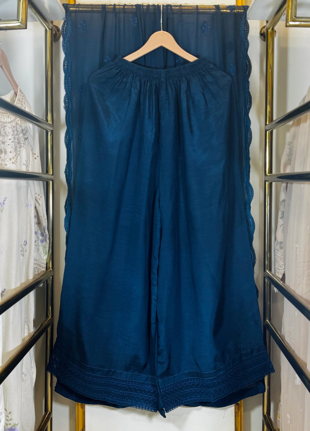 Whispered Teal captures serene elegance through a rich teal blue palette elevated with intricate embroidery. The delicately detailed kurta is paired with flowing trousers and a matching dupatta, creating a refined silhouette ideal for festive and semi-formal occasions.